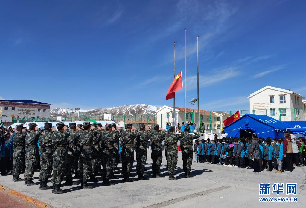 5月24日,武警青??傟?duì)果洛支隊(duì)機(jī)動(dòng)大隊(duì)官兵與花石峽鎮(zhèn)藏文中心寄宿制小學(xué)的師生一同參加升國(guó)旗儀式。新華社發(fā)(宦爵才郎 攝)