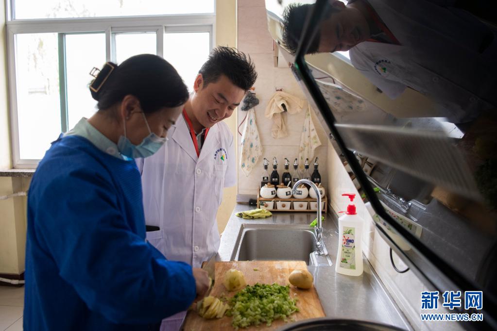 在太原市社會(huì)(兒童)福利院,黨龍祥(右)在廚房查看孩子們的輔食準(zhǔn)備情況(5月26日攝)。新華社記者 楊晨光 攝