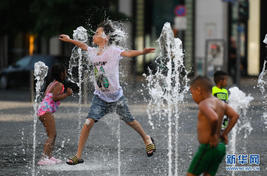 6月17日,小朋友在德國(guó)法蘭克福街頭戲水納涼。