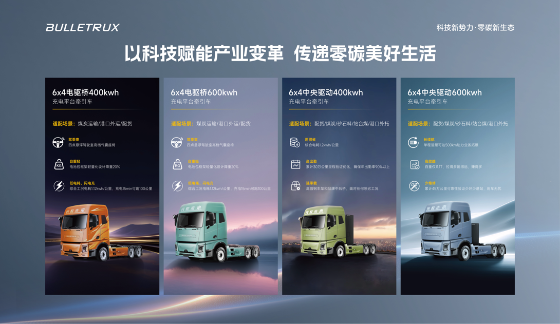 场景适配方面,四款产品精准覆盖全工况需求。6x4电驱桥400kWh/600kWh充电平台牵引车以“电池包+框架轻量化设计降重20%”为核心优势,搭配四点悬浮高档气囊座椅的舒适驾乘,精准适配煤炭运输、港口外运、配货等场景;6x4中央驱动600kWh充电平台牵引车:凭单程500km长续航赋能中长途业务,叠加“自重仅11.4T”的高效装载能力,适配配货、煤炭、砂石料等多场景,更经45万公里可靠性验证实现“少维修、少进站”;6x4中央驱动400kWh充电平台牵引车:以1.2kWh/公里的低电耗控成本,靠30万公里验证优化的90%以上稳定出勤率扛复杂工况,再以高强钢车架+品牌后中桥的强承载实力,从容应对各类恶劣作业环境。