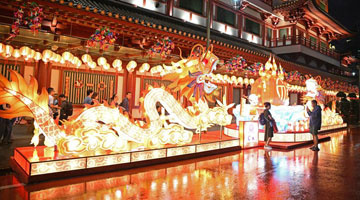 1月19日,游客在新加坡牛车水农历新年灯饰前拍照留影。新华社发(邓智炜 摄)