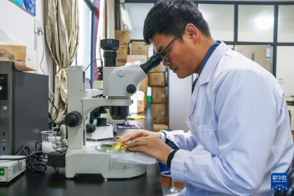 12月18日,黄山风景区管委会园林局高级工程师吴贻军在检验检疫室里观察松针样本。
