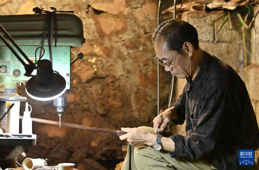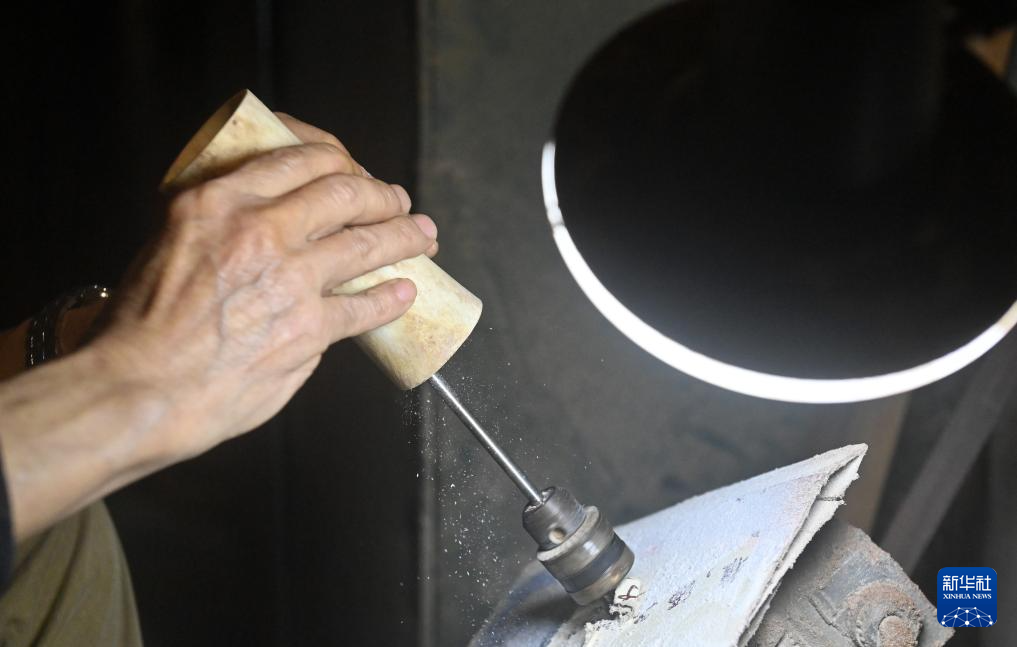 10月10日,黄一格在家中打磨一把马骨胡的琴筒。