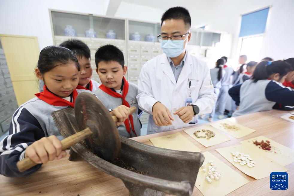 10月21日,山东省枣庄市市中区文化路小学的学生在一家中药店体验用铜冲捣药。