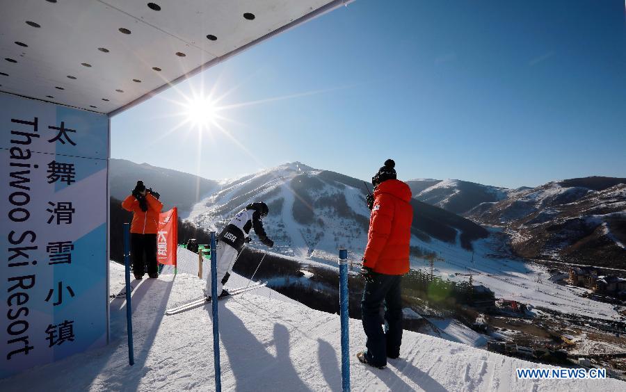 Tess Johnson (C) of the United States starts during the ladies' Moguls on the Day 1of the 2017-2018 Freestyle Skiing World Cup-Moguls & Aerials at the Thaiwoo ski resort in Chongli District of Zhangjiakou City, north China's Hebei Province, Dec. 21, 2017. (Xinhua/Meng Jing)