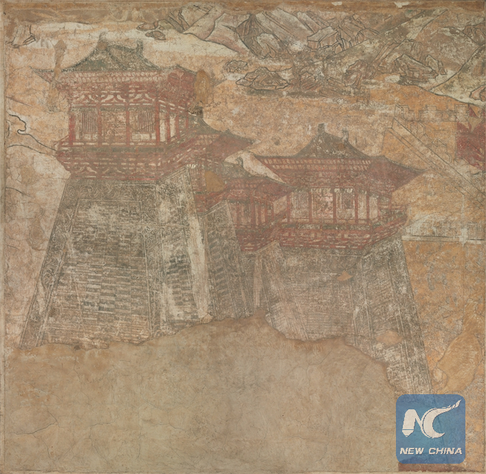 These towers decorated Prince Yide's tomb. The mural was drawn on the west side of the tomb passage, depicting a three-tower complex with mountains, rocks, valleys and plants in the background. The contrasts of light and shade and the forceful lines are typical of the early Tang style.