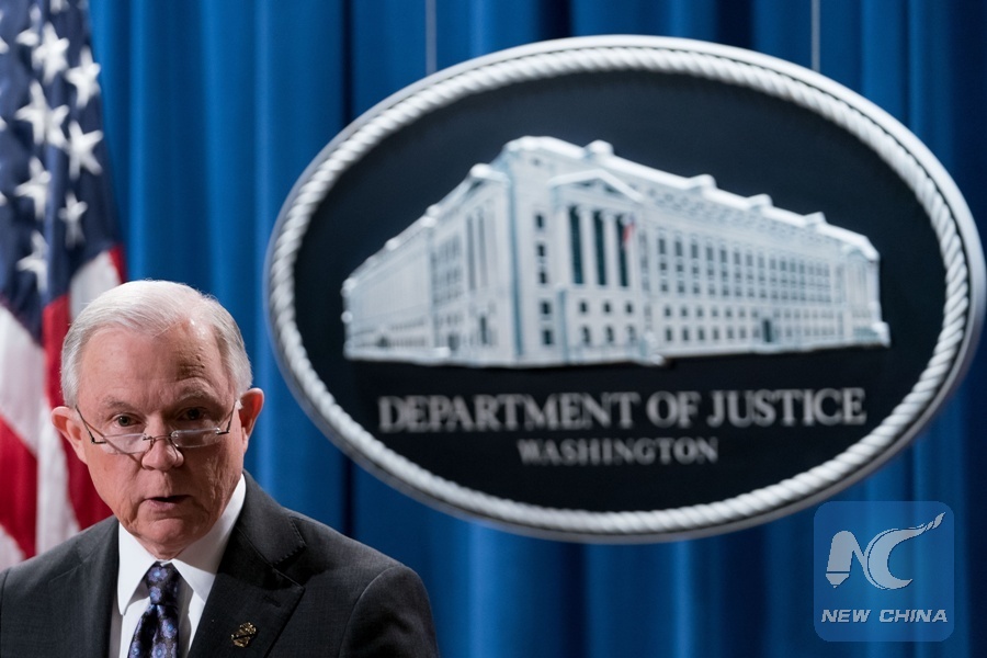 U.S. Attorney General Jeff Sessions speaks at a news conference at the U.S. Justice Department in Washington D.C., United States, on Nov. 29, 2017. (Xinhua/Ting Shen)