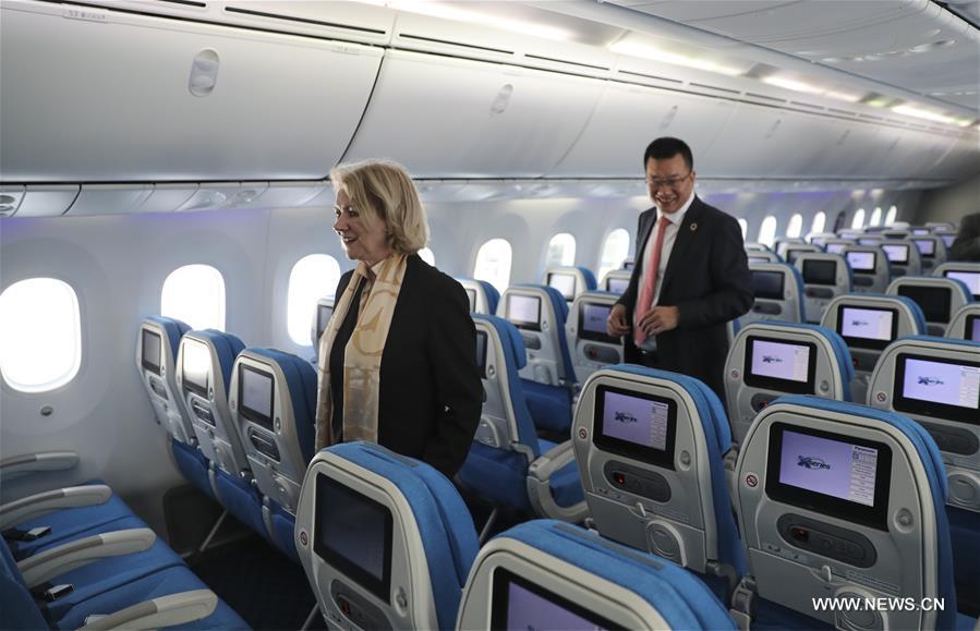 Alison Smale (L), under-secretary general for global communications at the UN Department of Public Information, and Zhao Dong, president of Xiamen Airlines, visit the new aircraft in Charleston, the United States, Jan. 26, 2018. China's Xiamen Airlines on Friday received its first aircraft bearing the UN (United Nations) message of sustainable development, hoping to promote the message worldwide. The Boeing aircraft was painted with a UN-sanctioned livery featuring the symbol of the 17-point Sustainable Development Goals (SDGs), and inscriptions in both Chinese and English. (Xinhua/Wang Ying)