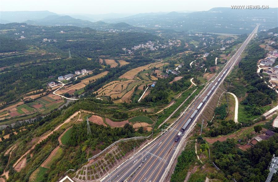 Photo taken on Sept. 14, 2017 shows a train running on Lanzhou-Chongqing railway, in the Guangyuan section within southwest China's Sichuan Province. Lanzhou-Chongqing railway, a major railway connecting Lanzhou City in northwestern province of Gansu with the southwestern metropolis Chongqing, will fully open to traffic on Sept. 29, 2017, according to a press conference held by Lanzhou Railway Bureau Thursday. The railway, which started construction in 2008, also runs through northwest China's Shaanxi Province and southwest China's Sichuan Province. It will play a crucial role in improving transportation efficiency and advance the development program for western China. (Xinhua/Liu Kun)