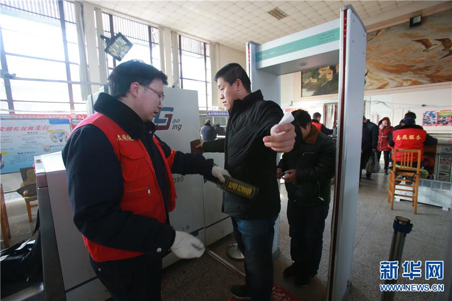 A volunteer helps with the security check work at Kaifeng Railway Station, in central China’s Henan Province, Feb. 1, 2018. (Xinhuanet/Li Junsheng)