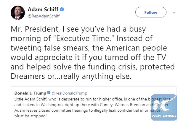 WASHINGTON, Feb. 5 (Xinhua) -- U.S. lawmaker Adam Schiff on Monday exchanged fire with President Donald Trump who slammed him over his efforts to release another edition of the disputed memo alleging the FBI and Justice Department of surveillance abuses in the Russia probe.