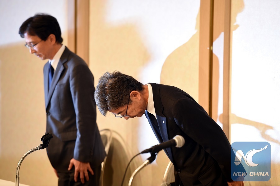 Kobe Steel Executive Vice President Naoto Umehara (R) bows over data fabrication and misconduct of employees in managerial positions during a press conference in Tokyo, Japan, Oct. 20, 2017. (Xinhua/Ma Ping)