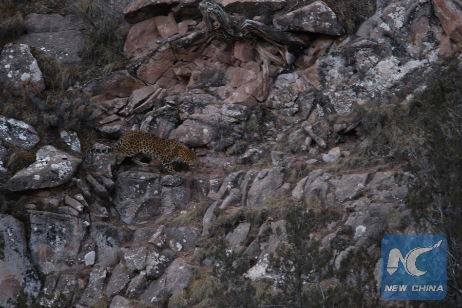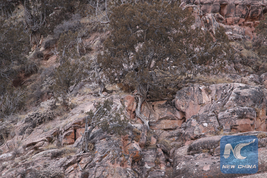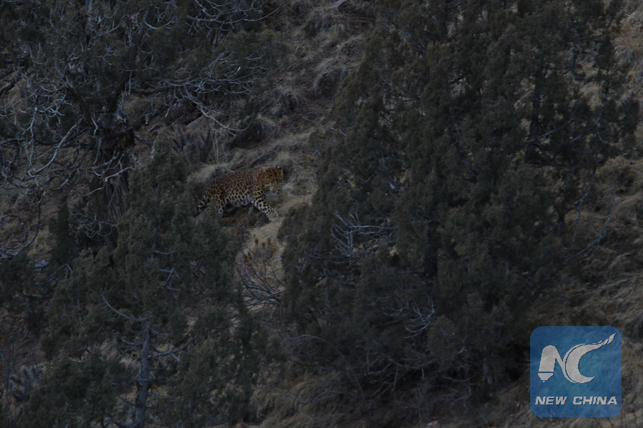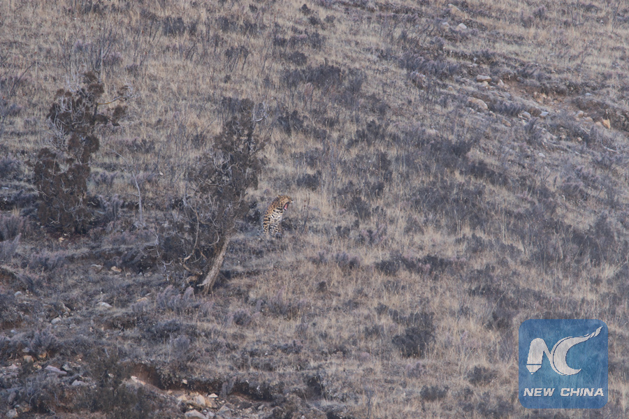 The rare leopard spotted in the Sanjiangyuan area of northwest China's Qinghai Province on Feb. 20, 2018. (Photo provided to Xinhua)