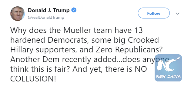 "If Trump were to stop the investigation or fire Mueller, there'd be a major political and constitutional crisis," Dan Mahaffee, senior vice president and director of policy at the Center for the Study of the Presidency and Congress, told Xinhua.