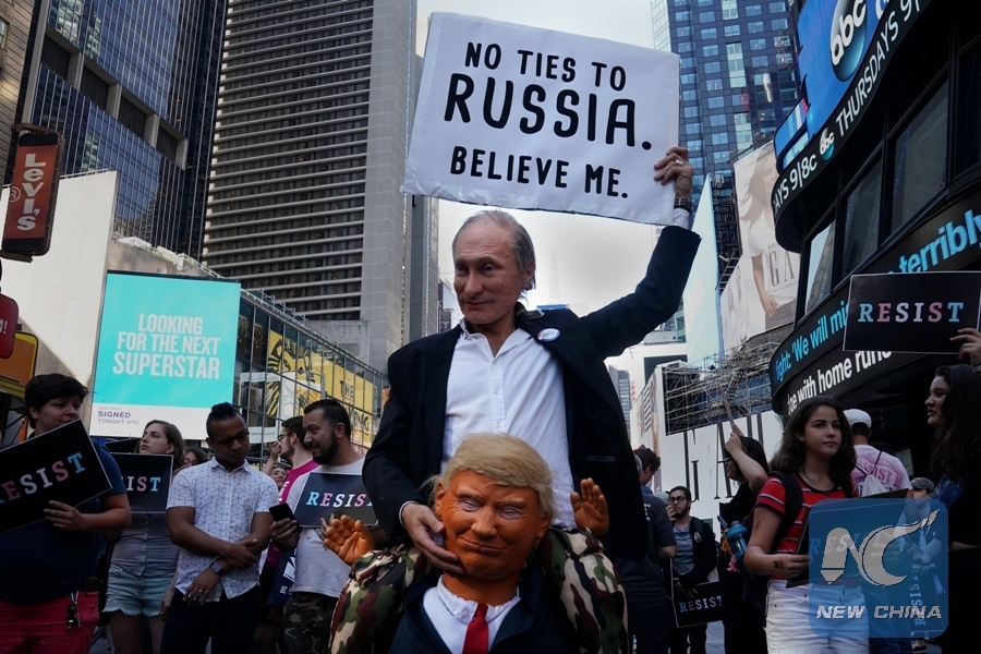File Photo: A participant dressed as both Russian President Vladimir Putin and U.S. President Donald Trump attends a protest against Trump's announcement that he plans to reinstate a ban on transgender individuals from serving in any capacity in the U.S. military, in Times Square, in New York City, New York, U.S., July 26, 2017. (Xinhua/REUTERS)