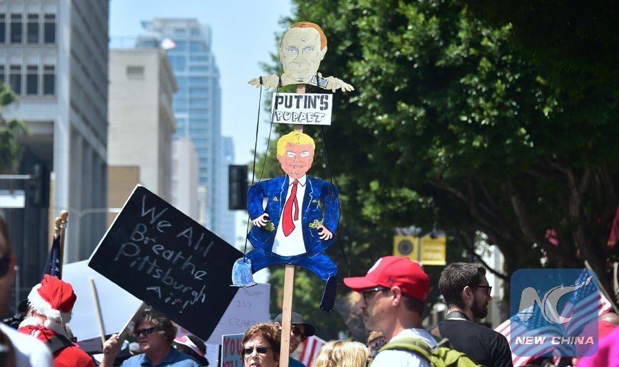 Activists carrying placards with political points of view march to City Hall through downtown Los Angeles, California on June 3, 2017, in the March For Truth, part of a peaceful nationwide demonstration aimed at restoring faith in American democracy and the U.S. electoral system. (Xinhua/AFP)