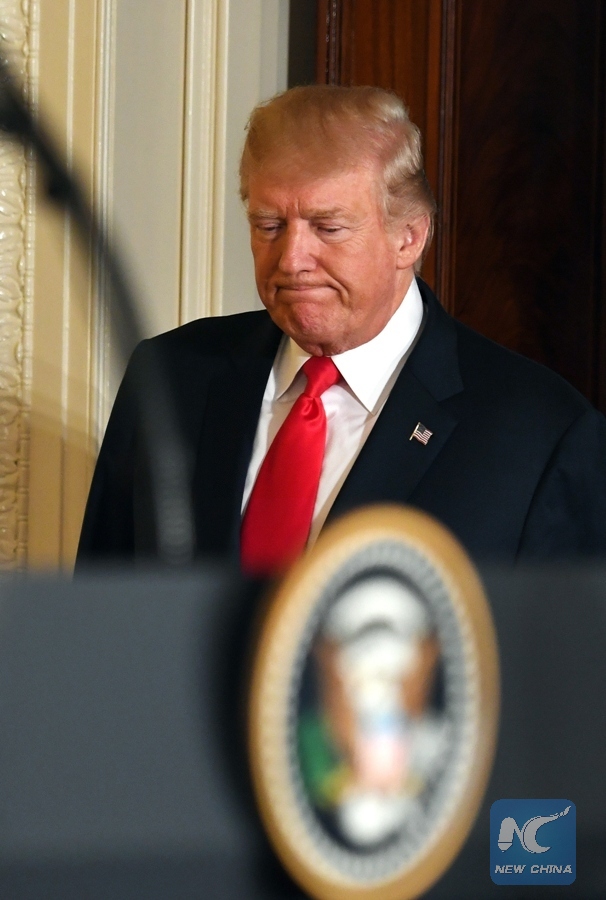 File Photo: U.S. President Donald Trump arrives for a joint news conference with Finnish President Sauli Niinisto (not in the picture) at the White House in Washington D.C., the United States, on Aug. 28, 2017. U.S. President Donald Trump said on Monday that he hoped the U.S. could have good relations with Russia, which would be "good for world peace." (Xinhua/Yin Bogu)