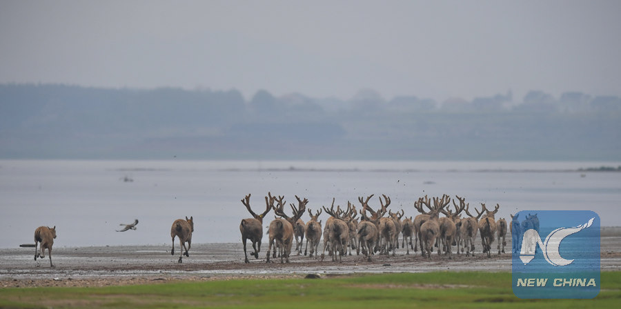 A herd of milu deer gallop in the wetland around Poyang Lake in east China's Jiangxi Province, April 3, 2018. (Xinhua/Zhou Mi)