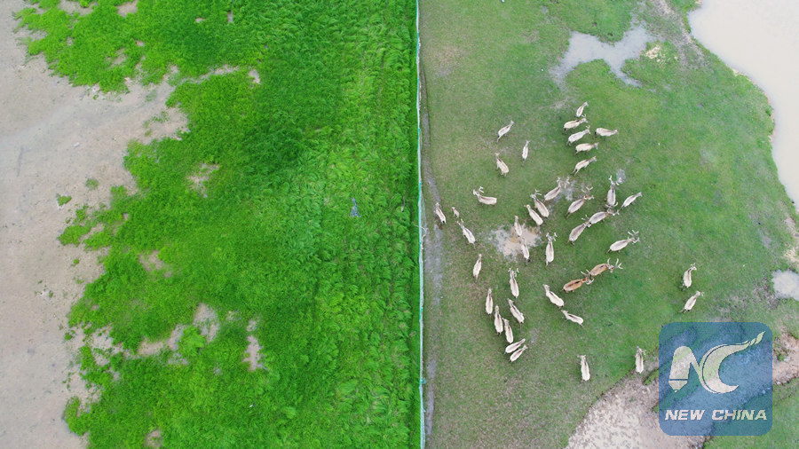 In this aerial photo taken on April 3, 2018, a herd of milu deer wait to be set free in the wetland around Poyang Lake in east China's Jiangxi Province. (Xinhua/Zhou Mi)