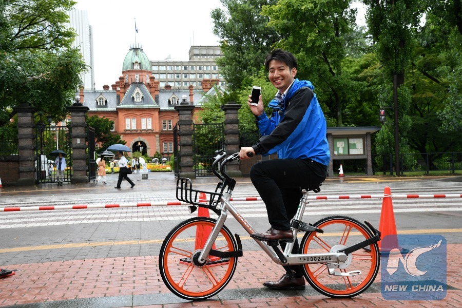 A TV reporter tries out a shared bicycle in Sapporo, Japan, on Aug. 22, 2017. (Xinhua/Hua Yi)