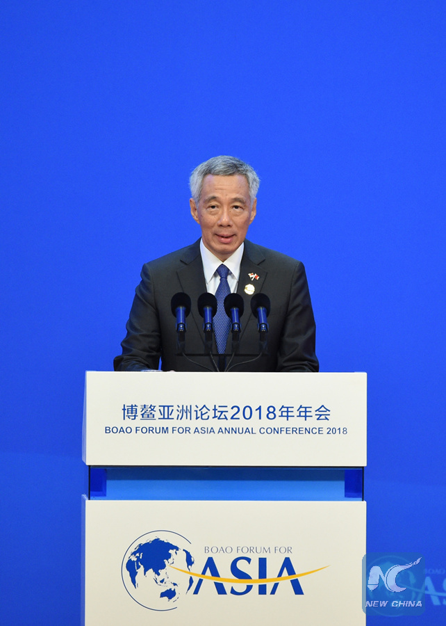 Singaporean Prime Minister Lee Hsien Loong addresses the opening ceremony of the Boao Forum for Asia Annual Conference 2018 in Boao, south China's Hainan Province, April 10, 2018. (Xinhua/Zhao Yingquan)