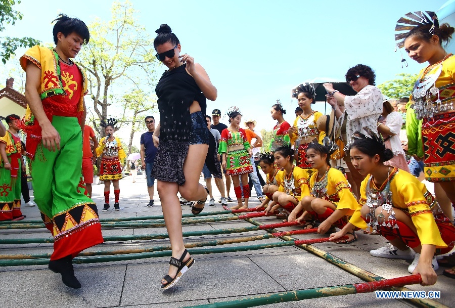 A foreigner and local people of Li ethnic group perform bamboo dance at Nanshan scenic area in Sanya City, south China's Hainan Province, Oct. 2, 2017. From Oct. 1 to 8, the eight-day National Day and Mid-Autumn Festival holiday, around 710 million tourist trips will be made across China, according to predictions by China National Tourism Administration. (Xinhua/Chen Wenwu)