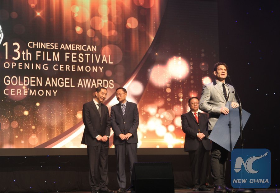 Stu Levy (front), who chairs the International Committee of Producers Guild of America (PGA), addresses the opening ceremony of the 13th Chinese American Film Festival (CAFF), in Los Angeles, the United States, Nov. 1, 2017. (Xinhua/Gao Shan)