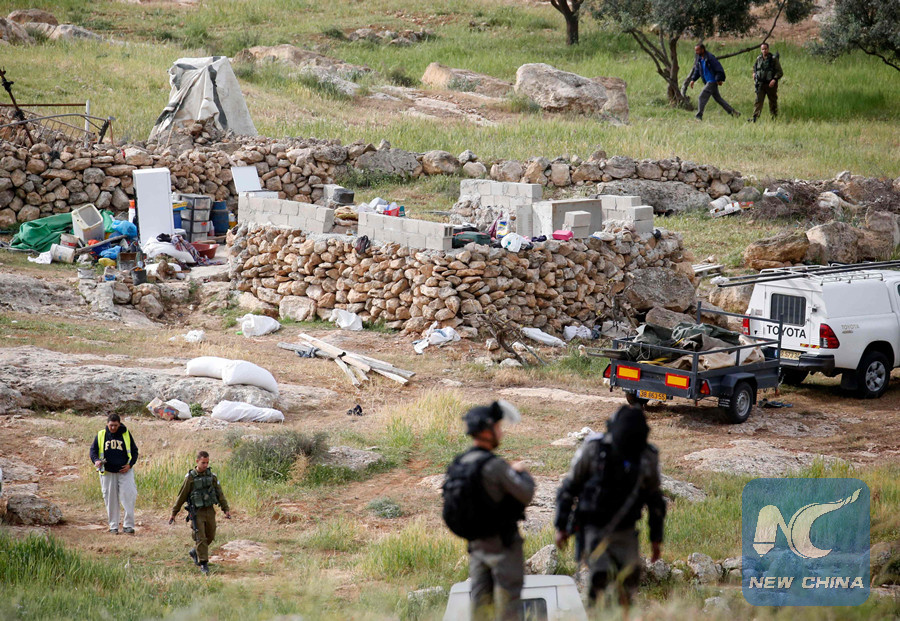 Israeli soldiers stand guard as Israeli workers remove a tent that was pitched near the Israeli settlement of Susya on March 28, 2018. (AFP photo)