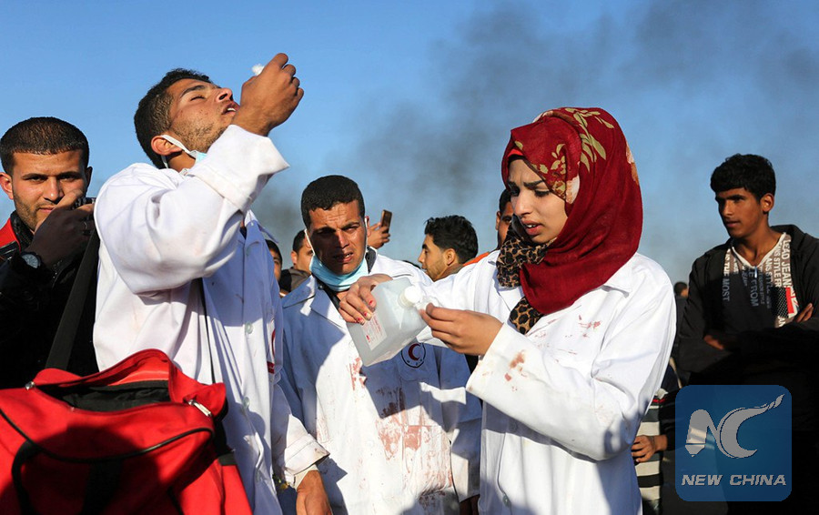 GAZA, June 1 (Xinhua) -- A Palestinian female, who volunteered as a paramedic, was killed and 100 injured Friday during clashes between hundreds of Palestinian protesters and Israeli soldiers in eastern Gaza Strip close to the border with Israel, medics said.
