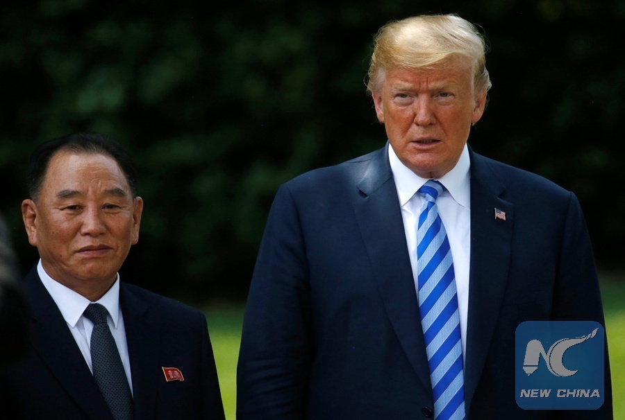 North Korea's envoy Kim Yong Chol poses with U.S. President DonaldTrump for a photo by an official photographer as he departs after a meeting at the White House in Washington, U.S., June 1, 2018. (Xinhua/REUTERS)