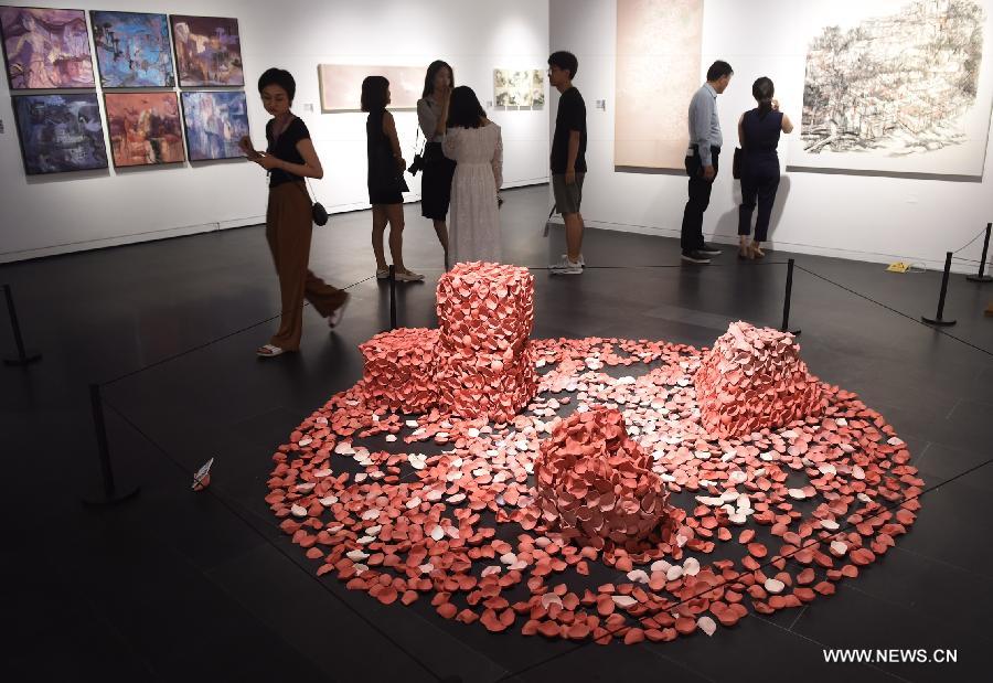 People visit a graduation exhibition of undergraduates of Tsinghua University Academy of Arts and Design in Beijing, capital of China, June 12, 2018. More than 500 pieces (sets) of works were displayed at the exhibition. (Xinhua/Luo Xiaoguang)