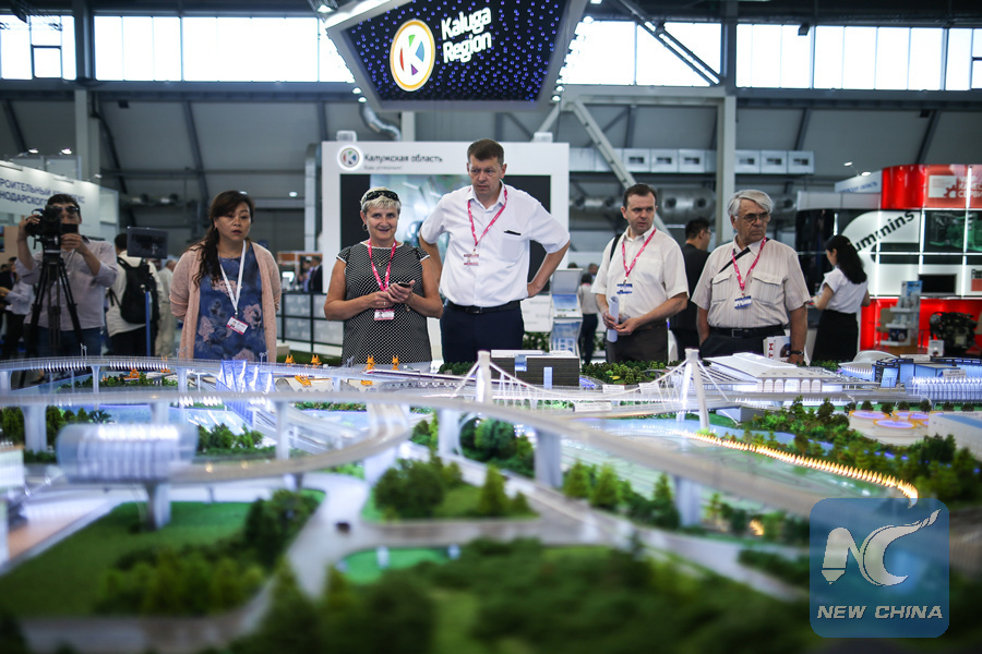 People look at the exhibit during the Russia-China expo at Innoprom Exhibition-2018 in Yekaterinburg, Russia, on July 9, 2018. (Xinhua/Evgeny Sinitsyn)