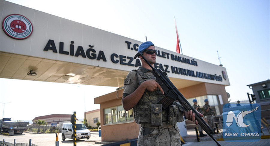 A Turkish soldier stands guard at the entrance of the Aliaga court and prison complex, during the trial of US pastor Andrew Brunson, held on charges of aiding terror groups, in Aliaga, north of Izmir, on July 18, 2018. (AFP)