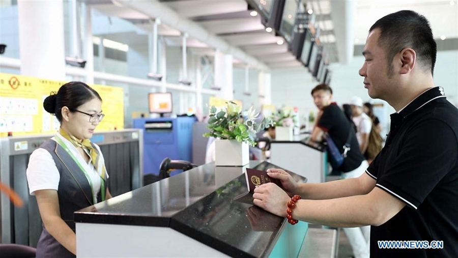Businessman Wu Yuwen checks in at Jieyang Chaoshan International Airport (JCIA) in south China's Guangdong Province, Aug. 17, 2018. (Xinhua/Huang Guobao)