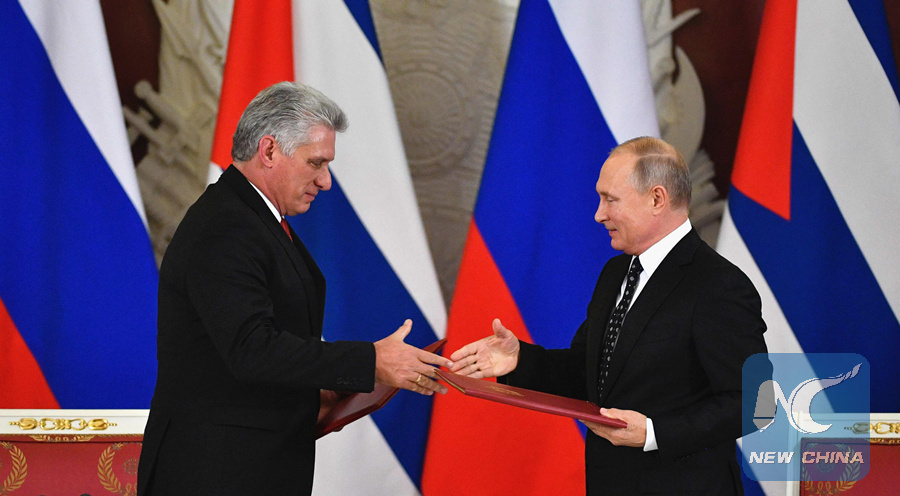MOSCOW, Nov. 2 (Xinhua) -- Russian President Vladimir Putin and his Cuban counterpart Miguel Diaz-Canel signed a joint statement on Friday on maintaining and strengthening their cooperation in international affairs.
