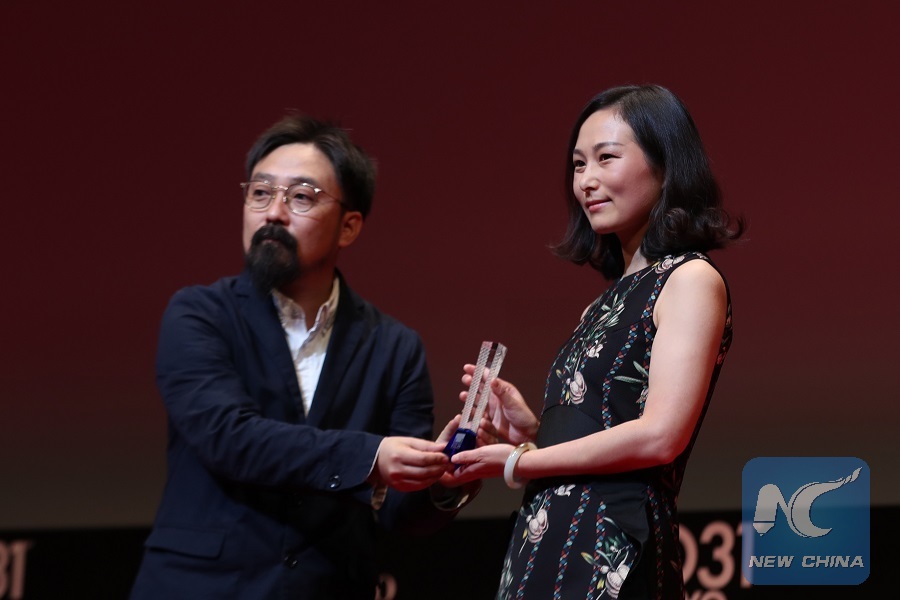 Chinese director Wang Lina (R) of film "A First Farewell" receives the Best Asian Future Award during the Tokyo International Film Festival in Tokyo, Japan, on Nov. 2, 2018. (Xinhua/Du Xiaoyi)