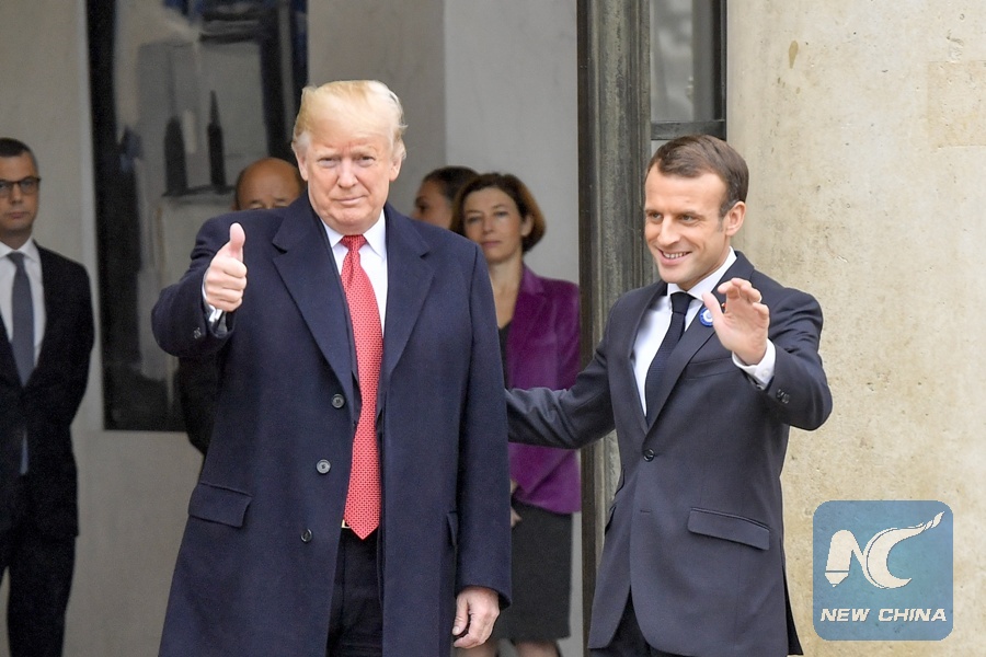 PARIS, Nov. 10 (Xinhua) -- On the eve of the centenary of the World War I armistice, French President Emmanuel Macron met here with visiting U.S. President Donald Trump Saturday, as the latter called for more fairness in security cooperation with Europe.
