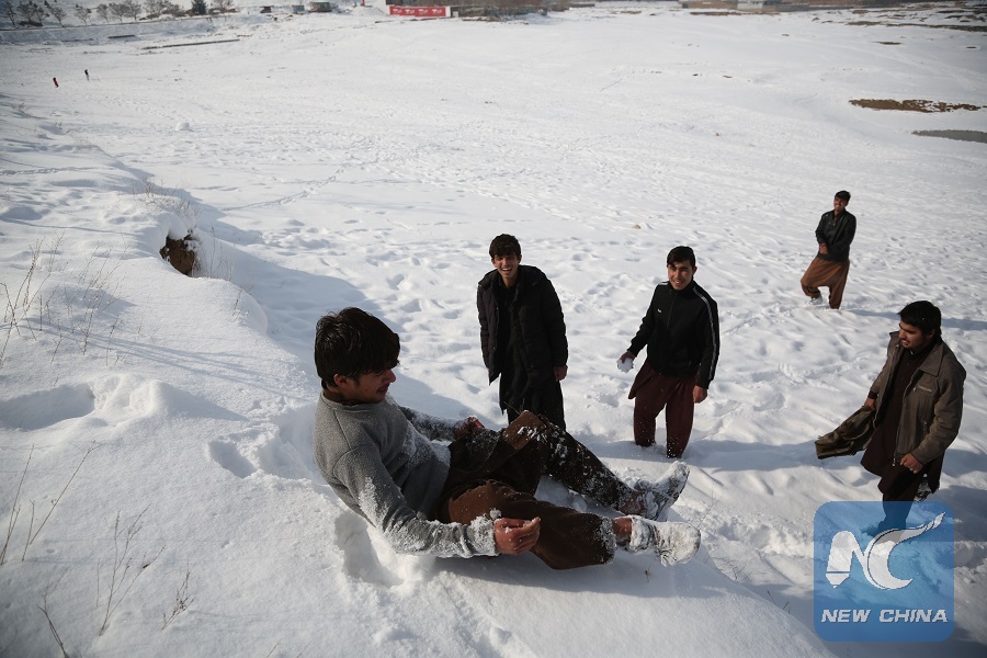 KABUL, Jan. 5 (Xinhua) -- Hundreds of overjoyed Kabul residents poured to the streets on Saturday to welcome and celebrate the first winter snowfall in the Afghan capital after long-lasting droughts in the war-battered country.