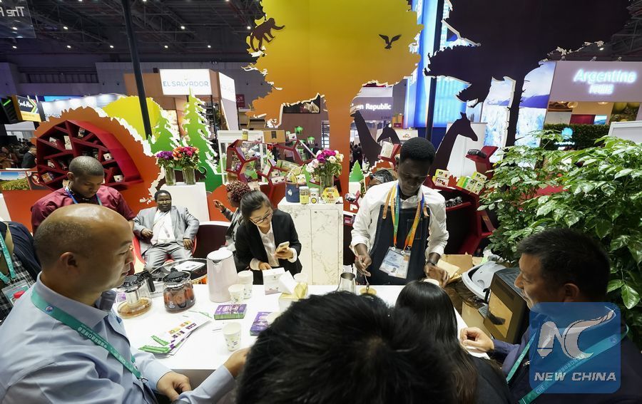 File photo shows a Kenyan exhibitor prepares coffee at the booth of Kenya at the first China International Import Expo in Shanghai, east China, Nov. 6, 2018. (Xinhua/Shen Bohan)