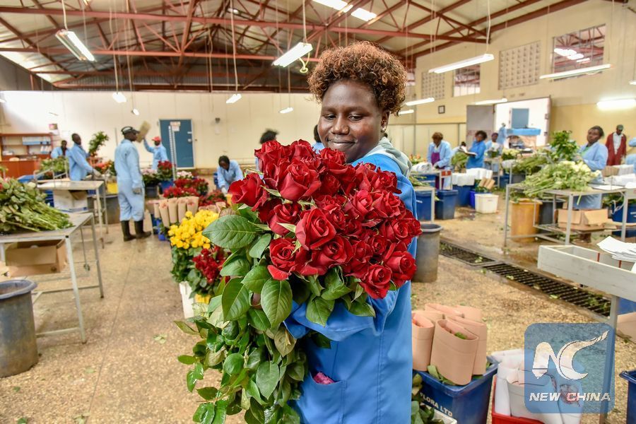 File photo shows a worker holds a bouquet of red roses during a sorting process at a flower farm in Nakuru,Kenya, Dec. 27, 2018. (Xinhua/Sheikh Maina)