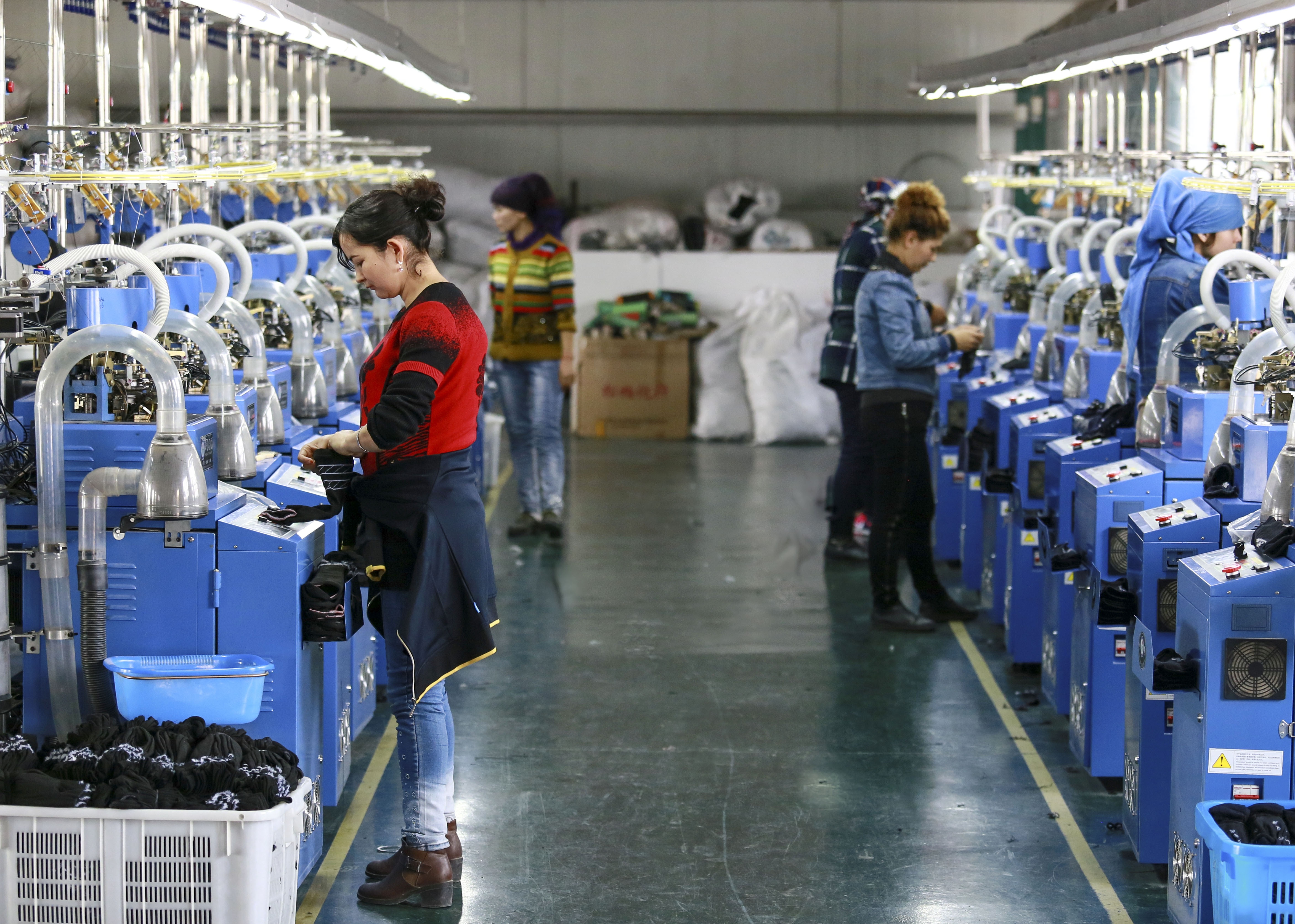 Staff members arrange cotton socks on a fully automatic hosiery machine at a knitting company in northwest China's Xinjiang Uygur Autonomous Region, April 29, 2017. (Xinhua)