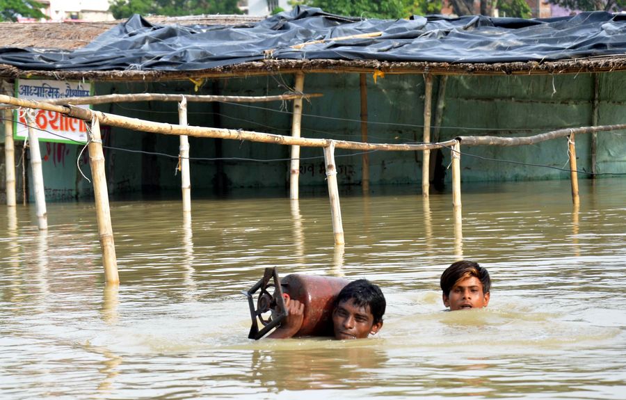 The file photo shows two boys carry a household item as they wade through a flooded street in Muzaffarpur district, Bihar, India, July 17, 2019. Many residents have been left homeless by recent flood caused by incessant rain in India's eastern state of Bihar. (Xinhua/Stringer)