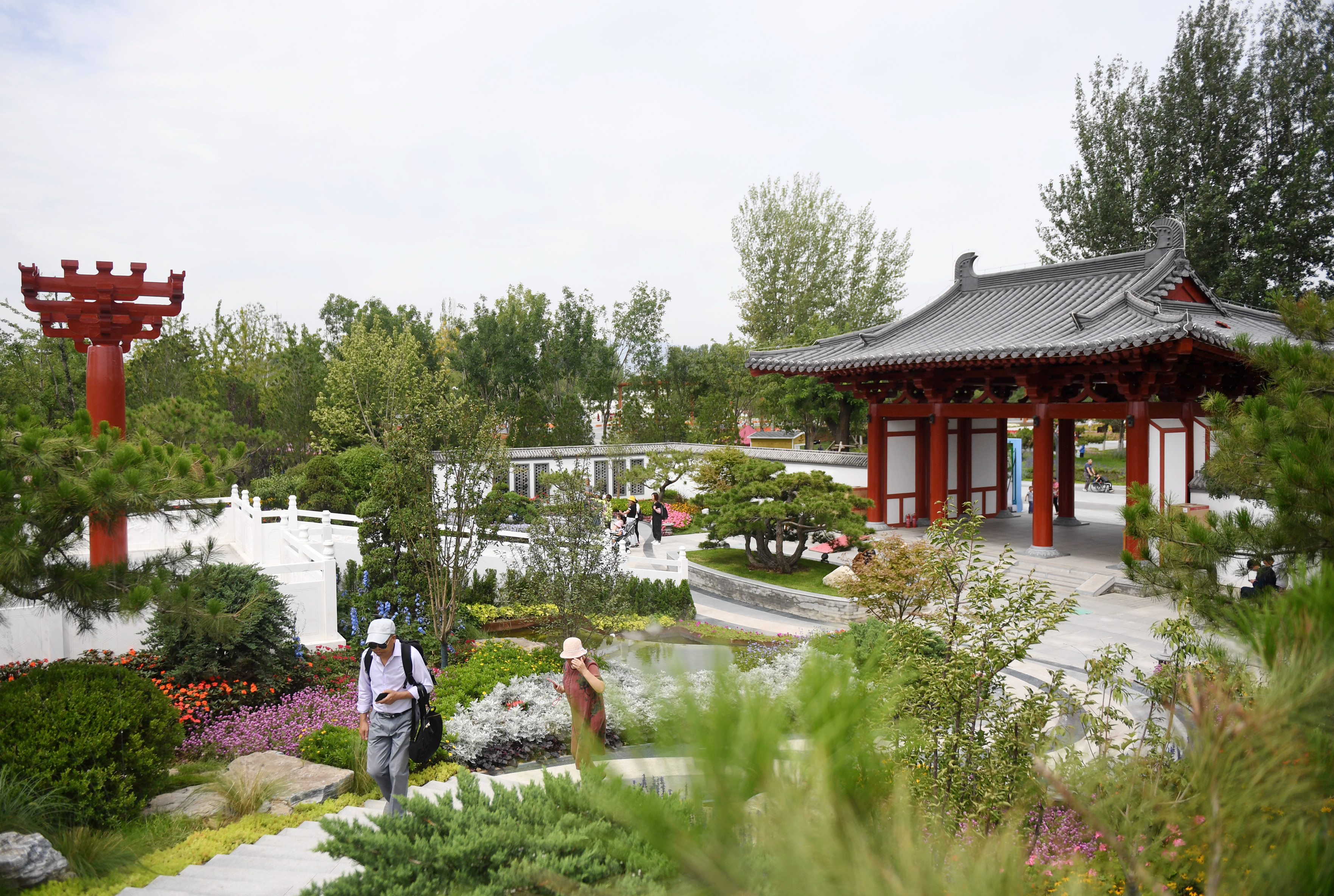 Visitors are seen at the Shaanxi Garden at the Beijing International Horticultural Exhibition in Beijing, capital of China, Aug. 22, 2019. (Xinhua/Zhang Chenlin)