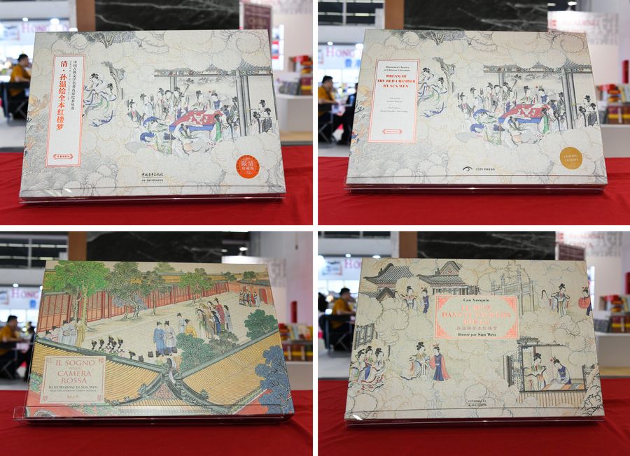 Combo photo taken on Oct. 17, 2019 shows limited editions in Chinese, English, French and Italian (clockwise) of "Illustrated Classics of Chinese Literature: Dream of the Red Chamber by Sun Wen" at Frankfurt Book Fair in Frankfurt, Germany.