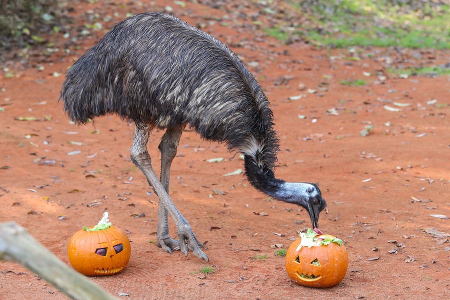 An emu ate food from a Halloween pumpkin in the zoo of Zagreb, Croatia, on Oct. 26, 2019. (Luka Stanzl/Pixsell via Xinhua)