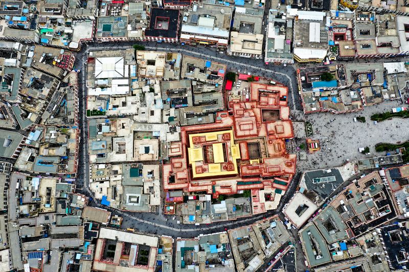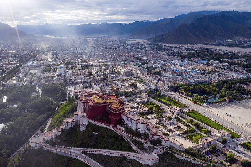 Aerial photo taken on Aug. 10, 2019 shows the Jokhang Temple in Lhasa, capital city of southwest China's Tibet Autonomous Region. (Xinhua/Wang Jianhua)