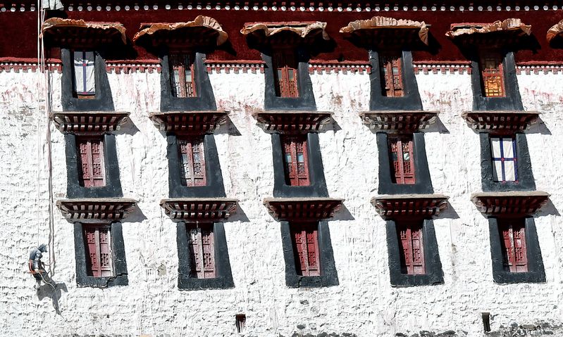 Workers paint the wall of the Potala Palace during its annual facelift in Lhasa, capital city of southwest China's Tibet Autonomous Region, Nov. 2, 2019. (Xinhua/Li Xin)