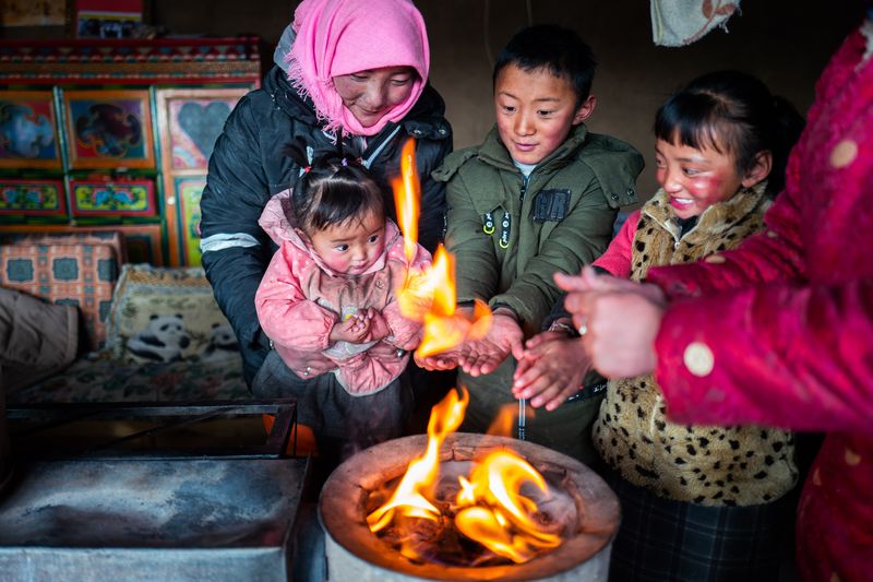 Herdswoman Qimei and her family warm hands by the fire at a herdsman resettlement site in Baingoin County, southwest China's Tibet Autonomous Region, Jan. 17, 2019. (Xinhua/Purbu Zhaxi)