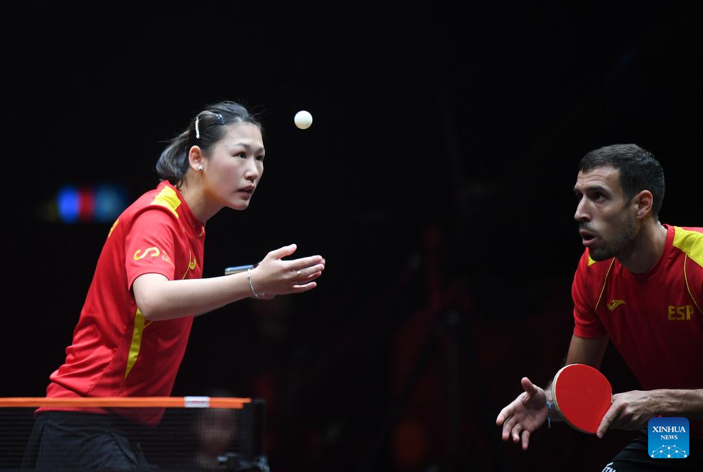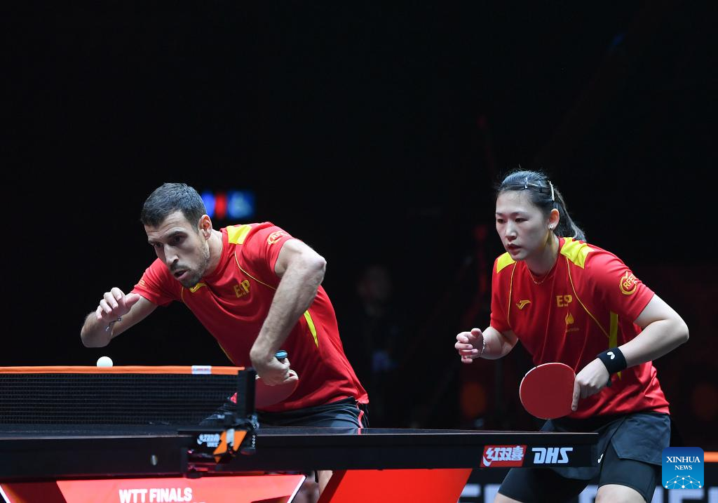 Alvaro Robles (R)/Maria Xiao of Spain compete during the mixed doubles group 2 match between Alvaro Robles/Maria Xiao of Spain and Matsushima Sora/Harimoto Miwa of Japan of the WTT Finals Hong Kong 2025 in Hong Kong, south China, Dec. 10, 2025. (Xinhua/Chen Duo)
