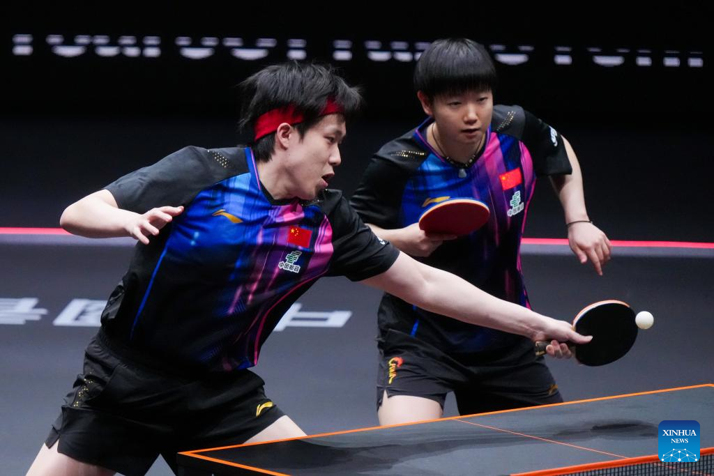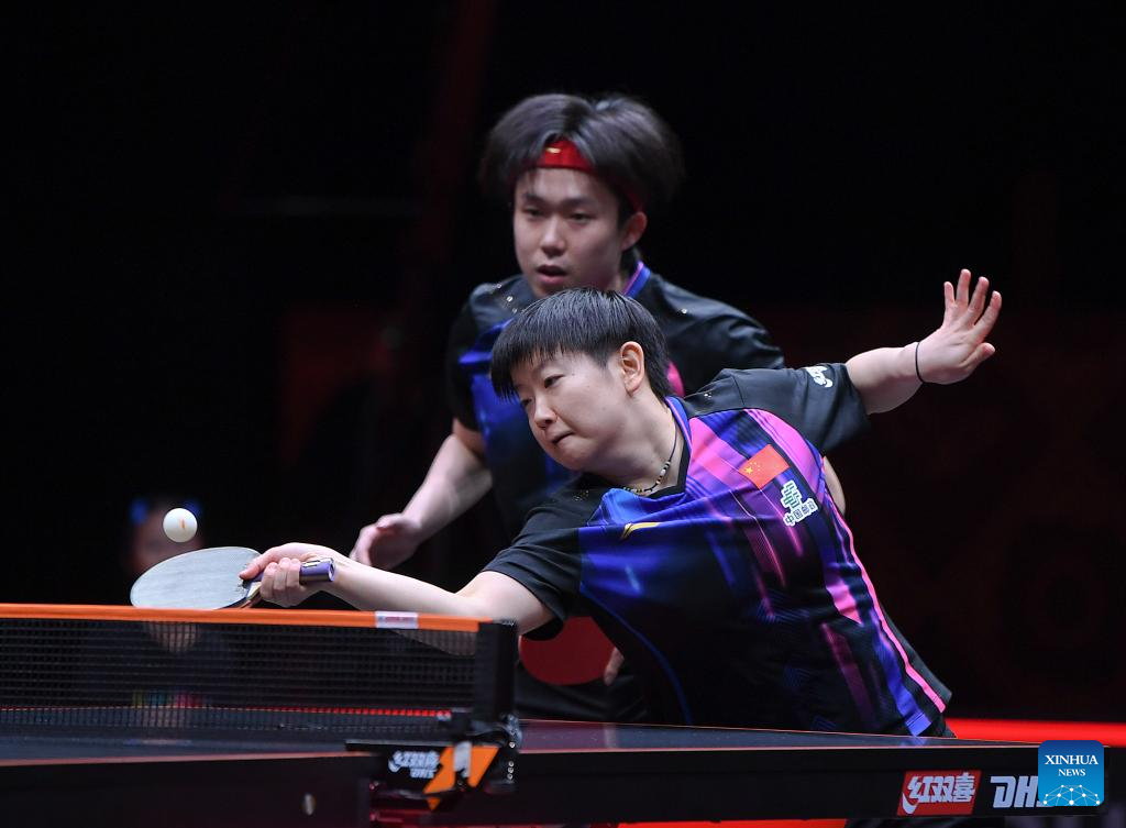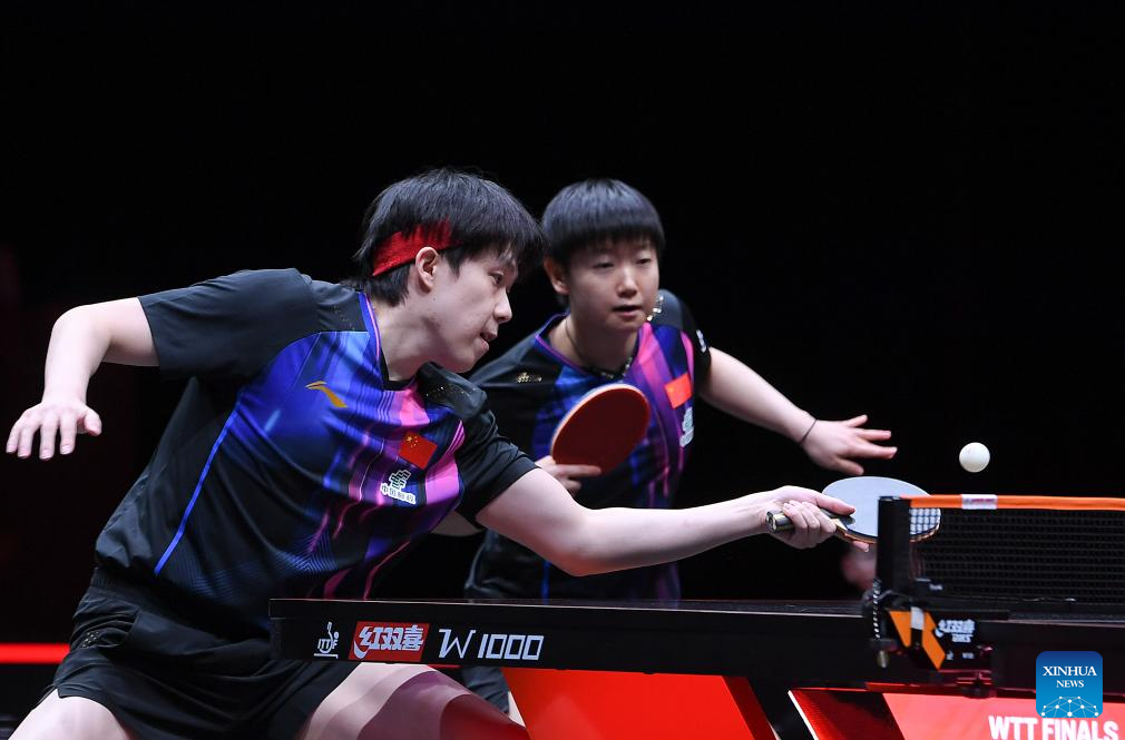 Wang Chuqin/Sun Yingsha (R) compete during the mixed doubles group 1 match between Wang Chuqin/Sun Yingsha of China and Manush Shah/Diya Chitale of India at the WTT Finals Hong Kong 2025 in Hong Kong, south China, Dec. 10, 2025. (Xinhua/Chen Duo)